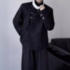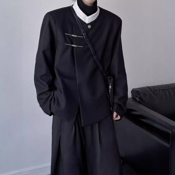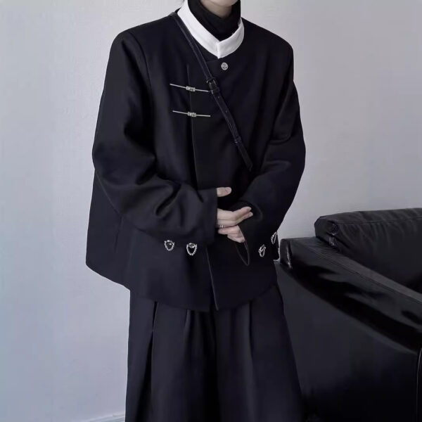 This versatile vertical collar jacket features a padded design and metal buckle details, offering a unique blend of traditional Chinese style with modern, casual fashion.
