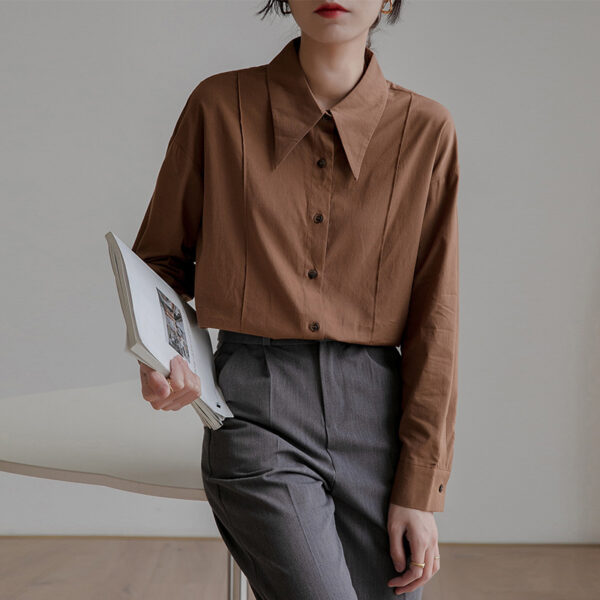 This Spring and Autumn pointed collar shirt for women features a loose, casual fit with a unique French design. A perfect blend of professionalism and relaxed style for everyday wear.